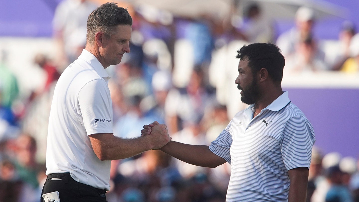 Justin Rose shakes his hands with JJ Spaun after Rose defeated Spaun after three playoffs on the 18th hole during the final round of FedEx St. Jude Championship at TPC Southwind in Memphis, Tenn., August 10, 2025. (Chris Day / The Commercial Appeal / USA Today Network via Imag images)