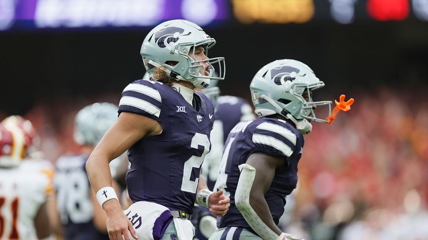 Kansas State Quarterback Avery Johnson throws a passport under Aer Lingus Classic between Iowa State and Kansas State at Aviva Stadium. (Laszlo Geczo/Inpho via Imag images)