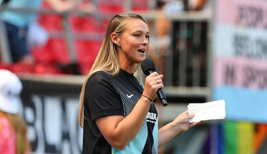 Kylie Kelce talks to the audience before an NWSL game on August 9, 2025 at Sports Illustrated Stadium in Harrison, New Jersey. (Rich Graessle/Icon Sportswire via Getty Images)