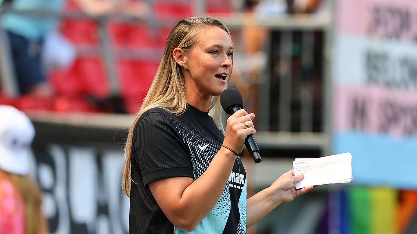 Kylie Kelce speaks to the crowd prior to the NWSL match on August 9, 2025 at Sports Illustrated Stadium in Harrison, New Jersey. (Rich Graessle/Icon Sportswire via Getty Images)