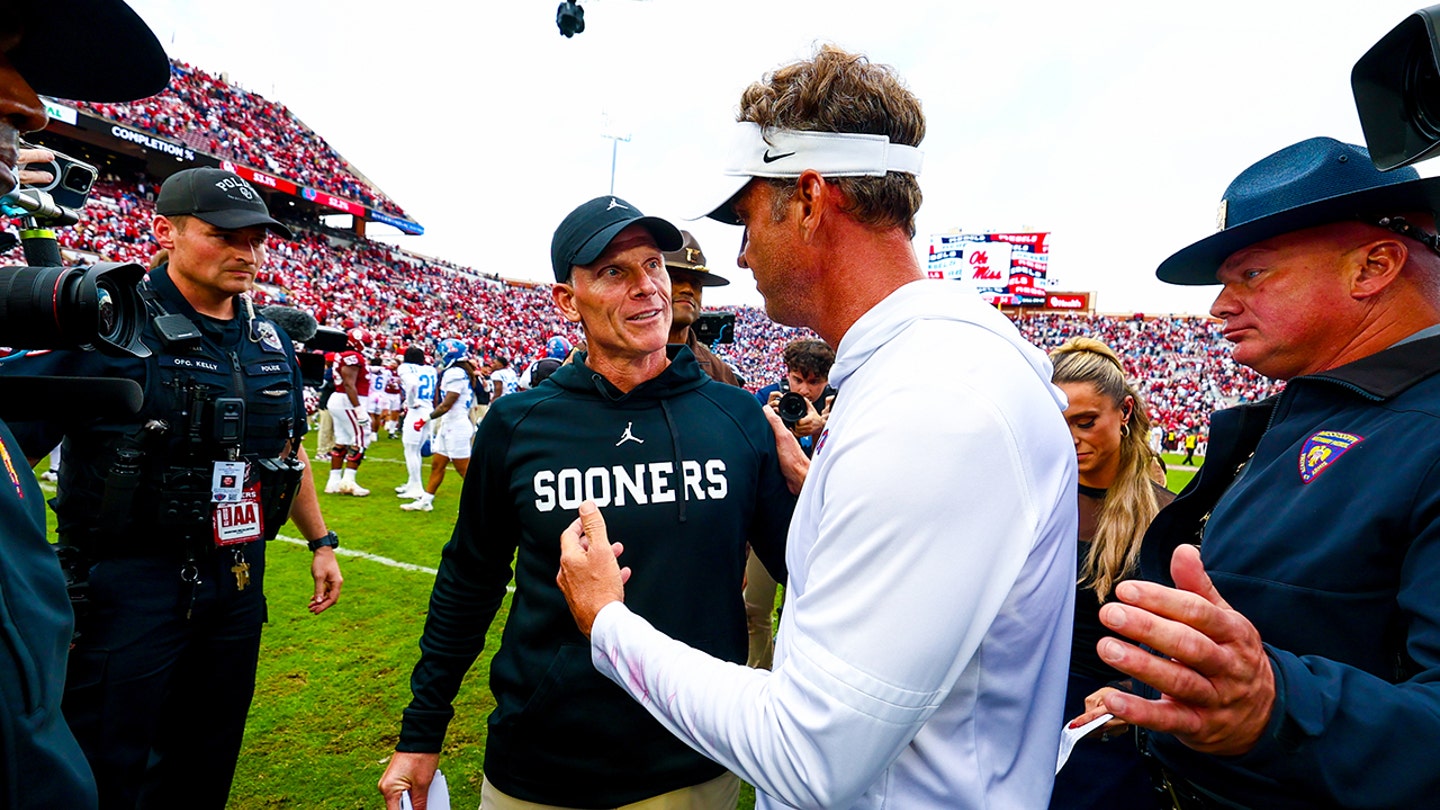 Ole Miss Rebels head coach Lane Kiffin, right, greets Oklahoma Sooners head coach Brent Venables after the game at Gaylord Family-Oklahoma Memorial Stadium. (Kevin Jairaj/Imagn Images)