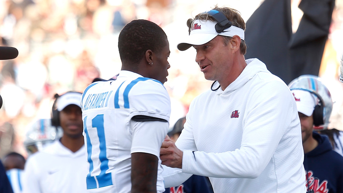 Mississippi Rebels head coach Lane Kiffin reacts with wide receiver Deuce Alexander (11) during the second half at Davis Wade Stadium at Scott Field on Nov. 28, 2025. (Petre Thomas/Imagn Images)