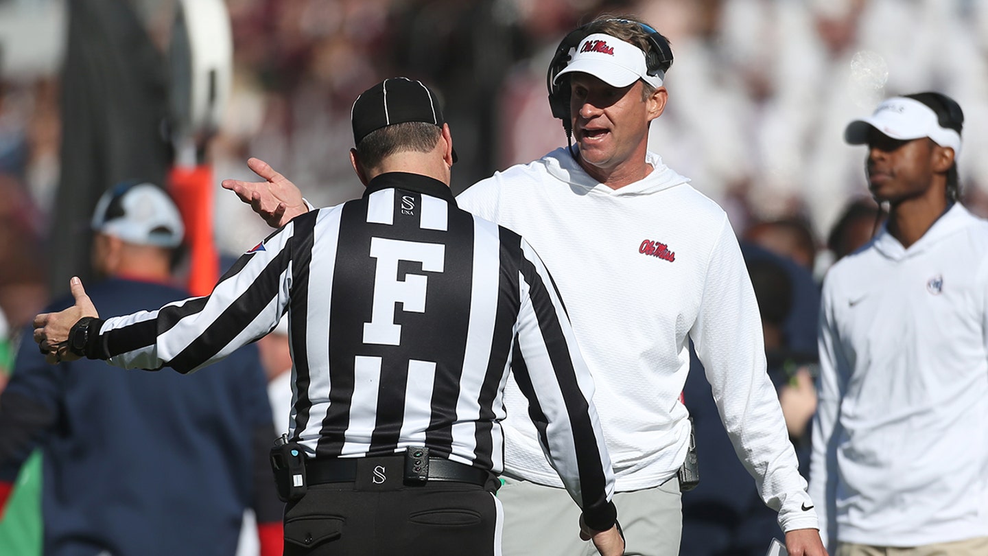Mississippi Rebels head coach Lane Kiffin talks to an official during the first half against the Mississippi State Bulldogs at Davis Wade Stadium at Scott Field on Nov. 28, 2025. (Petre Thomas/Imagn Images)