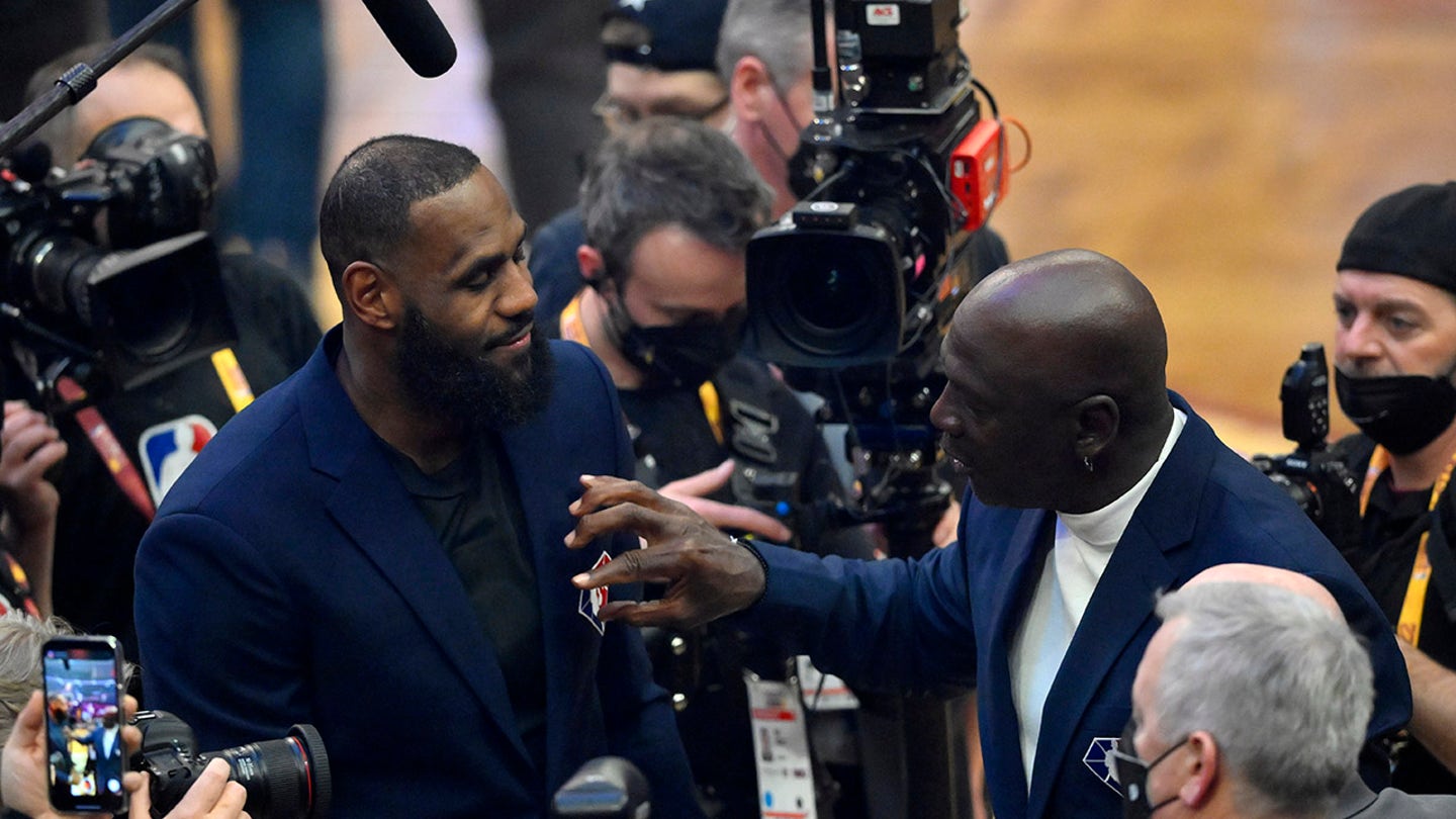 LeBron James and Michael Jordan on the field during the break during the 2022 NBA All-Star Game on Rocket Mortgage Fieldhouse. (David Richard-usa Today Sports)