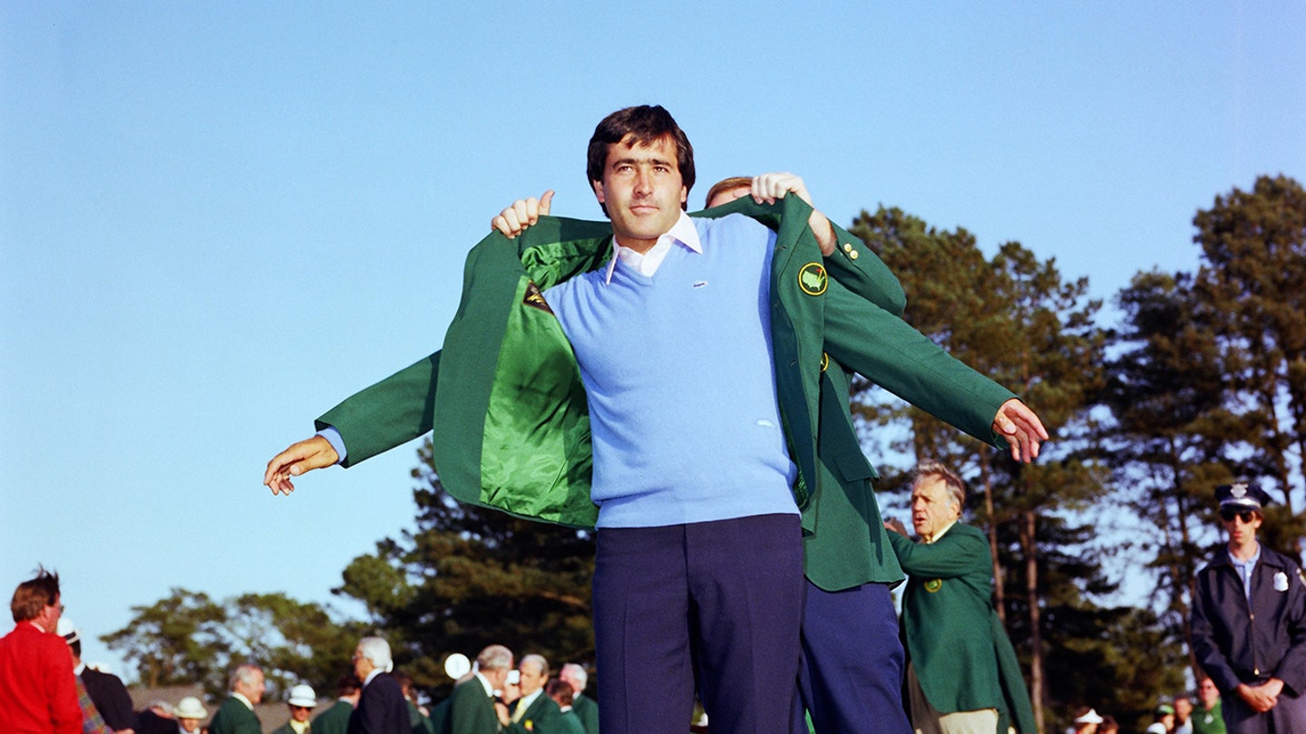 Seve Ballesteros puts on the green jacket during the 1983 Masters Tournament at Augusta National Golf Club on April 11, 1983 in Augusta, Georgia. (Augusta National/Getty Images)