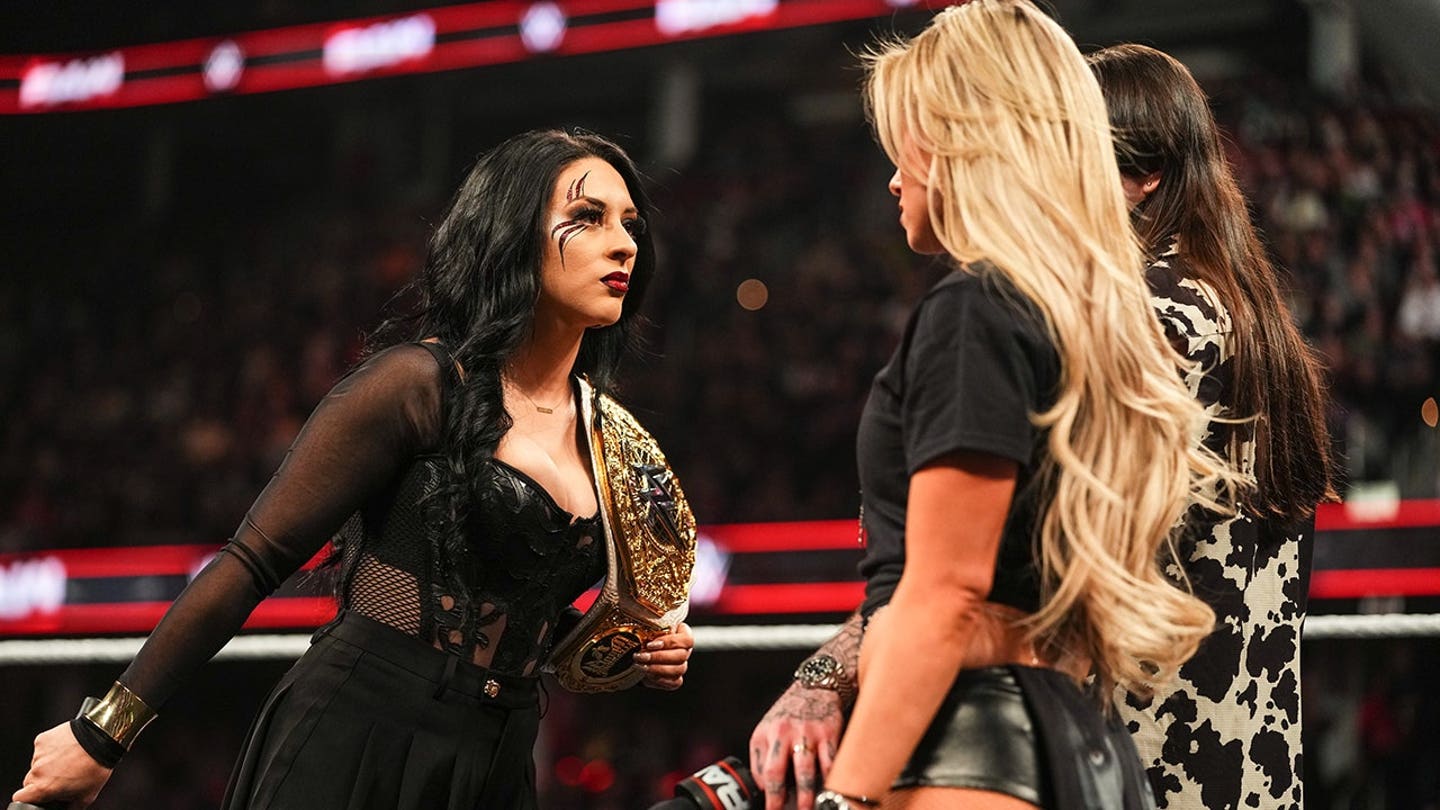 Stephanie Vaquer and Liv Morgan talk in the ring during Monday Night RAW at the Rocket Arena in Cleveland, Ohio on February 9, 2026. (Cooper Neill/WWE)