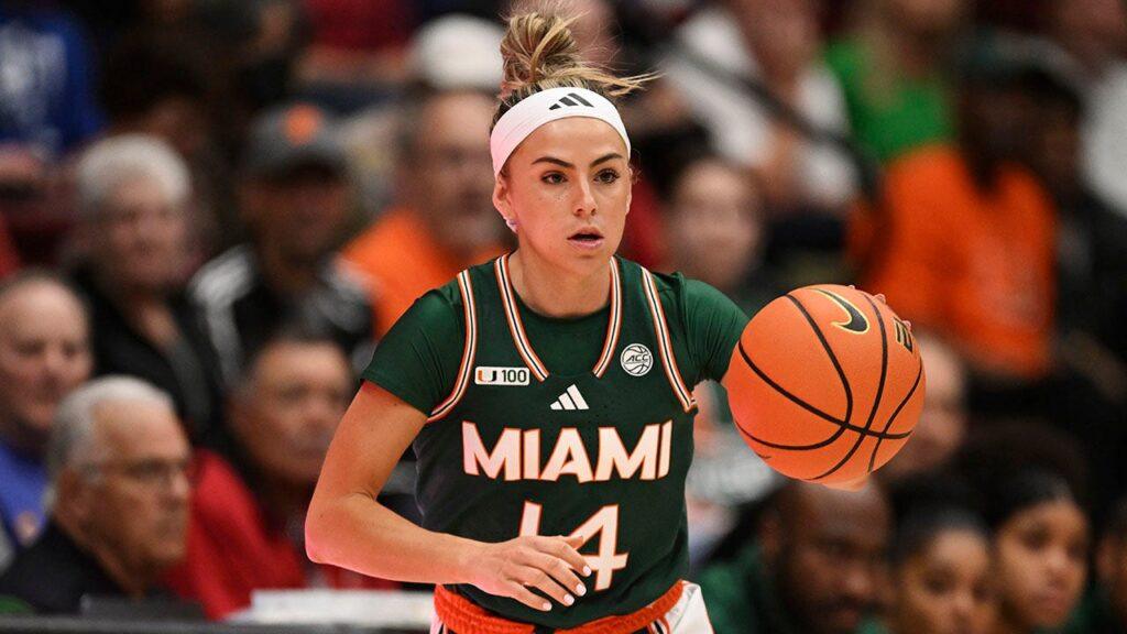 Haley Cavinder, #14 of Miami Hurricanes, moves the ball towards LSU Lady Tigers under Elite Eight Round in 2023 NCAA Women’s Basketball Tournament held at Bon Secours Wellness Arena on 26th, 2023 in Greenville, South Carolina. (Jacob Kupferman/NCAA -Photos via Getty Images)