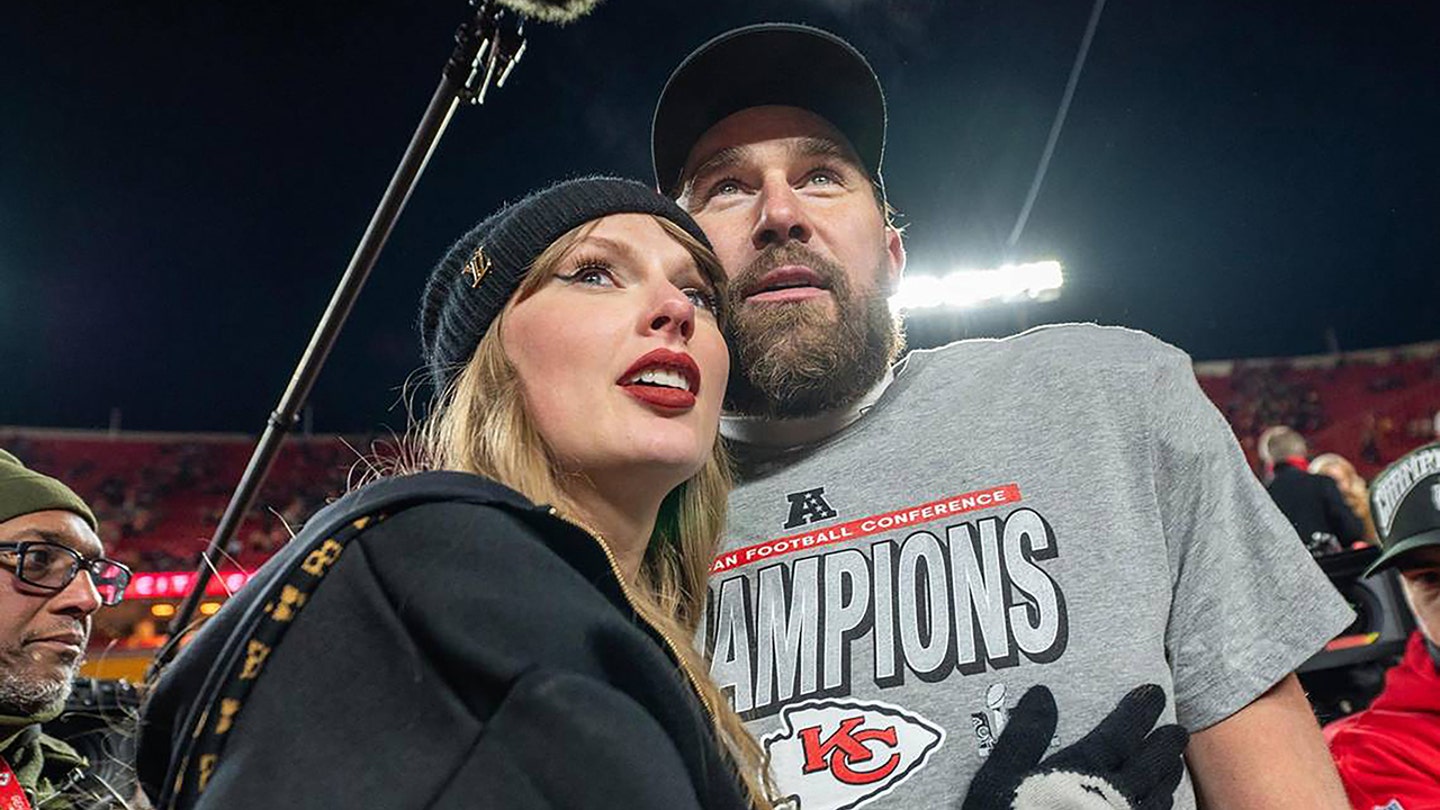 Taylor Swift, Left and Kansas City Chief’s tight end Travis Kelce goes off the field after the trophy ceremony after Chiefs ’32 -29 victory over Buffalo Bills in the AFC Championship Game on January 26, 2025 at Geha Field at Arrowhead Stadium in Kansas City, Missouri. (Emily Curiel/Kansas City Star/Tribune News Service via Getty Images)