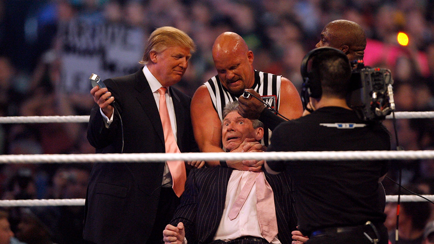 Donald Trump, Stone Cold Steve Austin and WWE wrestler Bobby Lashley prepare to shave Vince McMahon’s head after McMahon lost the main event of the night, “Hair vs. Hair”, between Vince McMahon and Donald Trump. WrestleMania 23 at Detroit’s Ford Field in Detroit, Michigan on April 1, 2007. (Leon Halip/WireImage)