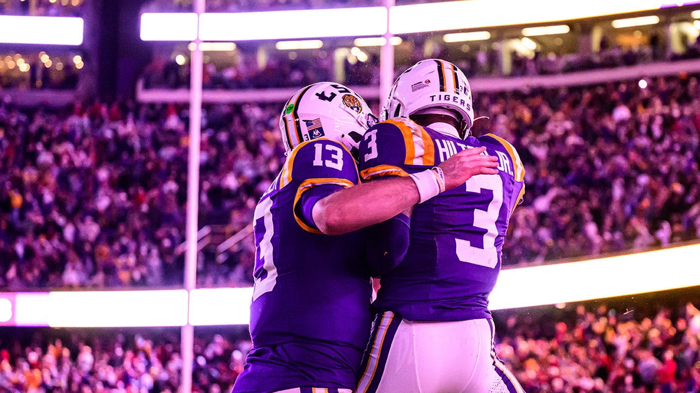 Chris Hilton Jr. From the LSU Tigers celebrates his touchdown with Garrett Nussmeier in the second quarter against Oklahoma Soners at Tiger Stadium on November 30, 2024 in Baton Rouge, Louisiana. (Gus Stark/LSU/University Images via Getty Images)