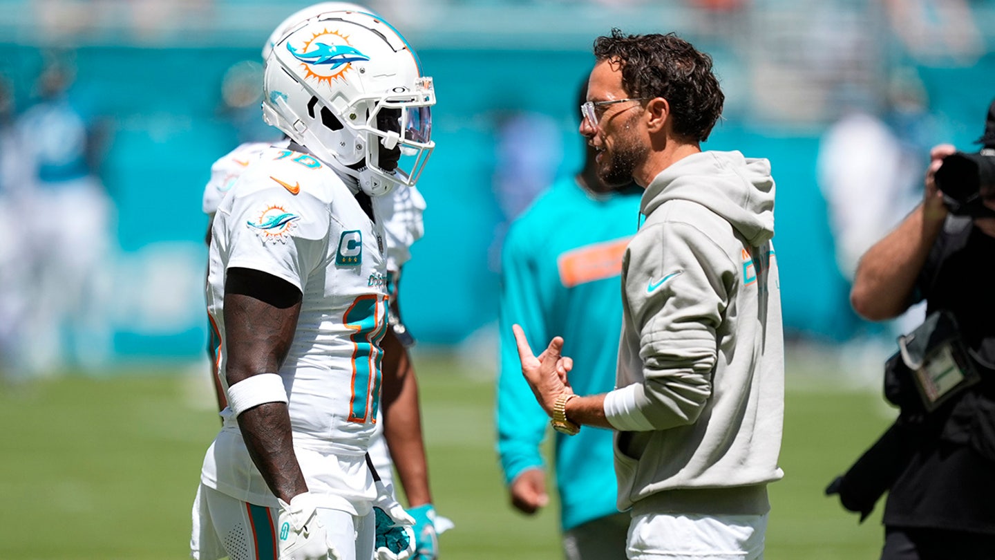 Miami Dolphins head coach Mike McDaniel talks with wide receiver Tyreek Hill (10) before an NFL football game against the Jacksonville Jaguars on Sunday, Sept. 8, 2024, in Miami Gardens, Florida. (AP Photo/Rebecca Blackwell)