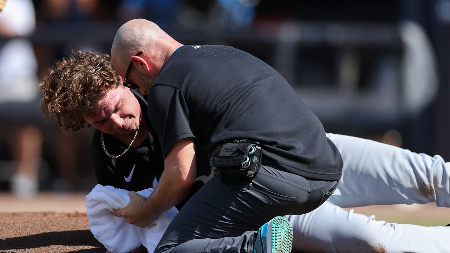 But Marlins -Catcher Nick Fortes’ throw to Second caught the Weathers right in the head, and Weathers quickly fell to the haug.