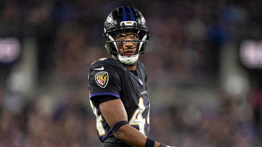 Marlon Humphrey (44) of the Baltimore Ravens warms up prior to an NFL football game against the Kansas City Chiefs at GEHA Field at Arrowhead Stadium on September 5, 2024 in Kansas City, Missouri. (Kevin Sabitus/Getty Images)