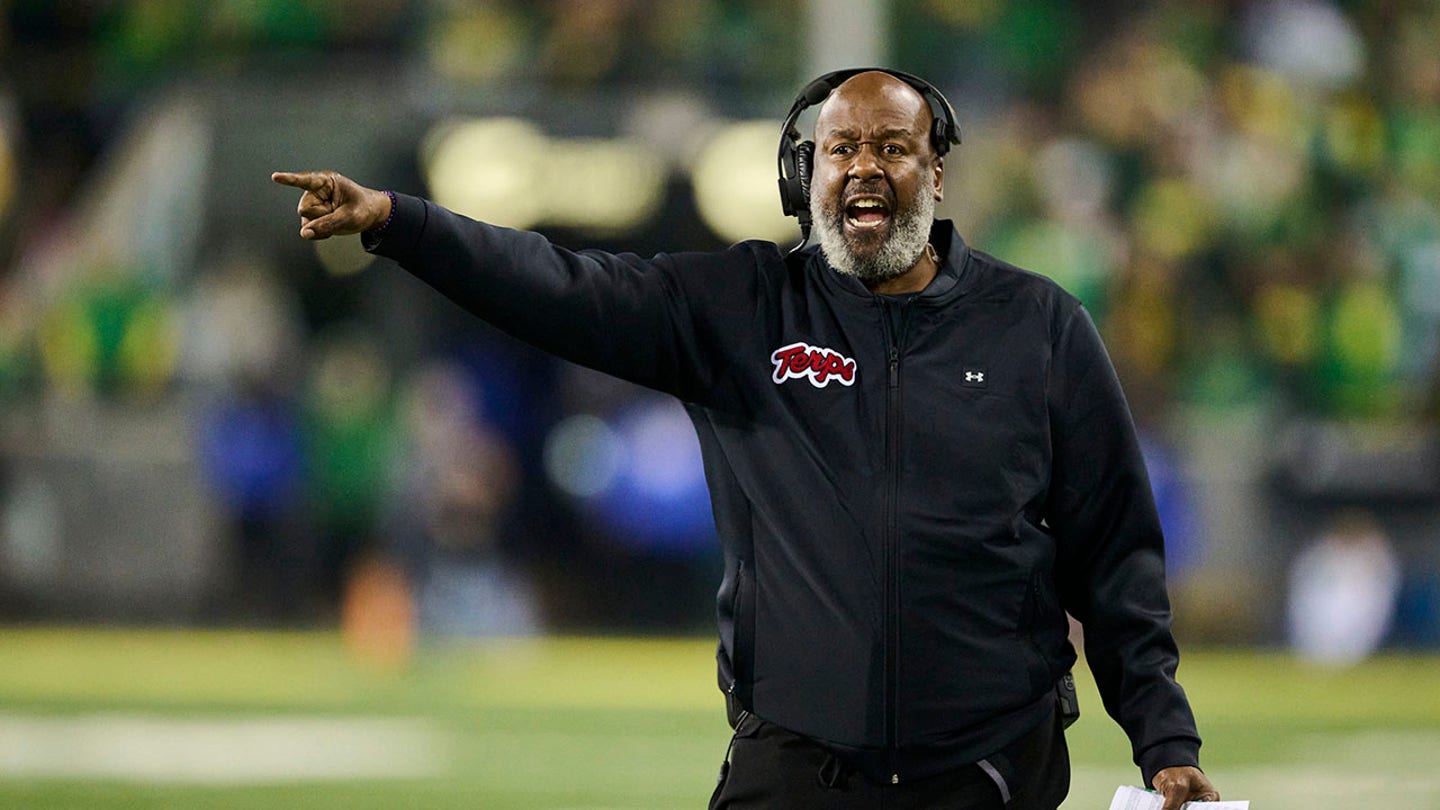 Maryland Terrapin’s main coach Mike Locksley questions a call in the second half against Oregon Ducks at Autzen Stadium. (Troy Waylynen-Misted Pictures)