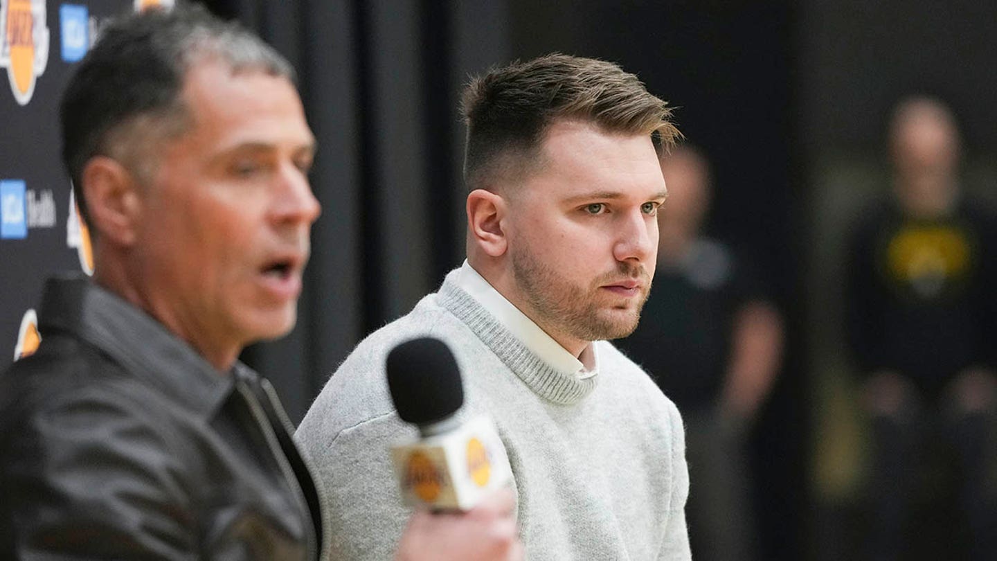 Los Angeles Lakers’ Luka Doncic, Right and General Krybe Rob Pelinka Field Questions during an initial NBA basketball press conference on Tuesday, February 4, 2025 in El Segundo, Calif. (AP Photo/Jae C. Hong)