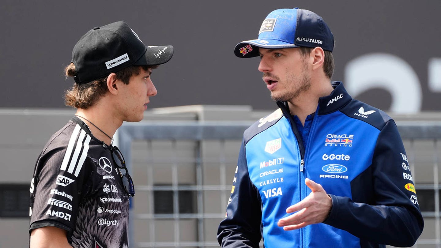 Red Bull driver Max Verstappen, right, of the Netherlands and Mercedes driver Kimi Antonelli of Italy talk during the drivers’ parade ahead of the Japanese Formula One Grand Prix in Suzuka, central Japan, Sunday, March 29, 2026. (AP Photo/Eugene Hoshiko)