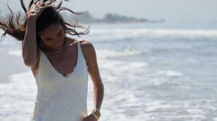Meghan wore a floating white dress as she ran joyfully through shallow sea waves on a beach. The Duchess of Sussex’s hair was loose and blew in the wind as she smiled, with a bracelet visible on her wrist.