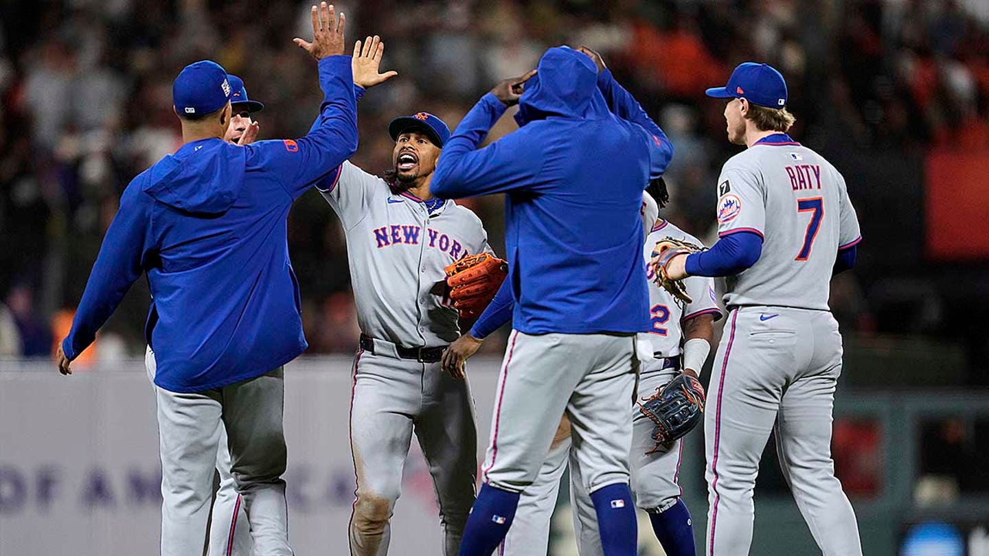 The New York Mets Shortstop Francisco Lindor, #12, celebrates with teammates after their win over San Francisco Giants in a baseball match on Saturday, July 26, 2025 in San Francisco. (AP Photo/Godofredo A. Vásquez)