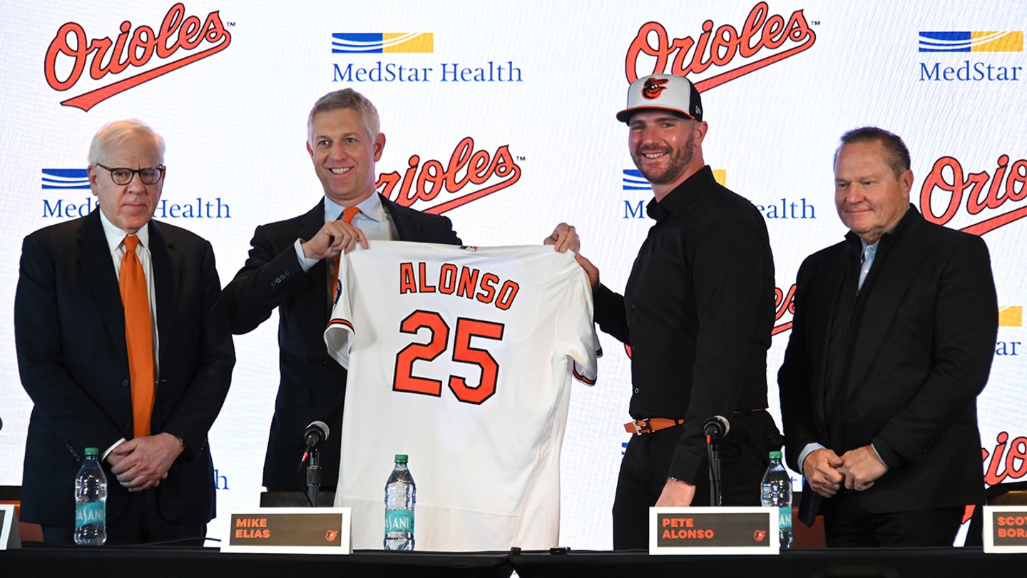Baltimore Orioles owner David Rubenstein, president of baseball operations Mike Elias and agent Scott Boras introduce new first baseman Pete Alonso at a press conference at Camden Yards on Friday, Dec. 12, 2025, in Baltimore. (Lloyd Fox/Baltimore Sun/Tribune News Service via Getty Images)