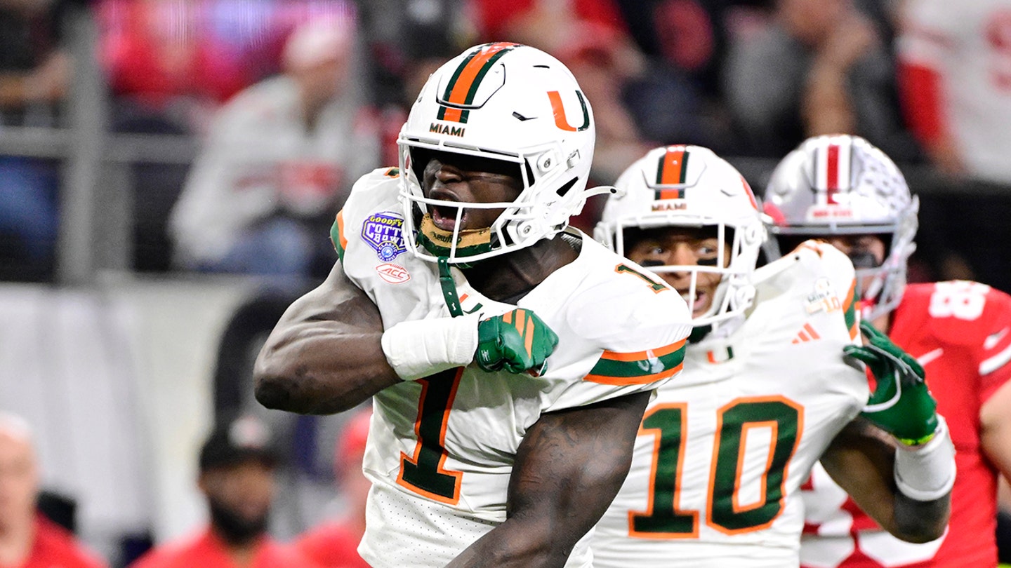 Mohamed Toure of the Miami Hurricanes reacts after a stop in the second quarter against the Ohio State Buckeyes during the 2025 College Football Playoff quarterfinals at the 90th Goodyear Cotton Bowl Classic at AT&T Stadium on December 31, 2025 in Arlington, Texas. (Stacy Revere/Getty Images)