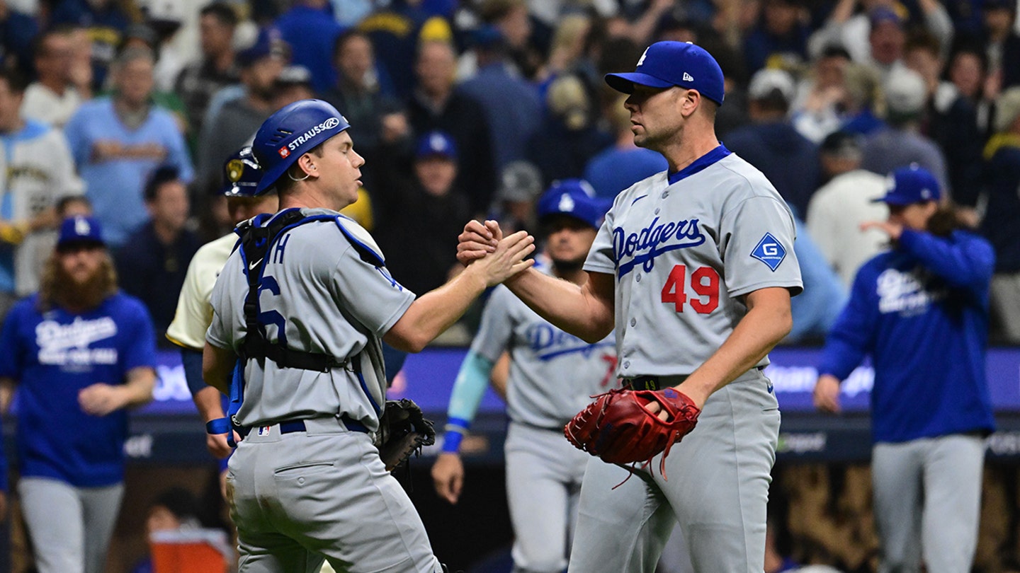 Los Angeles Dodgers Catcher Will Smith (16) and the Emergency Relief Blake Treinen (49) respond after defeating Milwaukee Brewers under Game 1 in the National League Championship Series at American Family Field. (Benny Sieu/Imag photos)