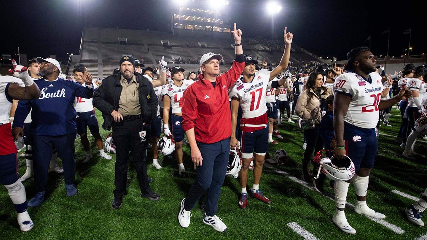 South Alabama Jaguars head coach Major Applewhite celebrates with his team during the Salute to Veterans Bowl at the Cramton Bowl in Montgomery, Alabama on Dec. 15, 2024. (Jake Crandall/The Advertiser/USA Today Network via Imagn Images)