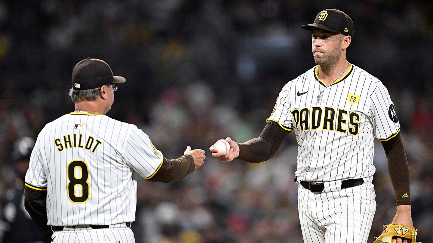 San Diego Padres Manager Mike Shildt, #8, takes the ball from relief Jason Adam, #40, during a pitching change in the eighth round against Chicago White Sox in Petco Park in San Diego on September 21, 2024. (Orlando Ramirez-Preferred Pictures)