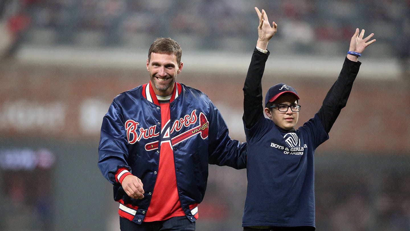 Former Atlanta Braves player Jeff Francoeur appears with a Boys & Girls Club member before Game 3 in the 2021 World Series between Braves and Houston Astros. (Brett Davis-usa Today Sports)