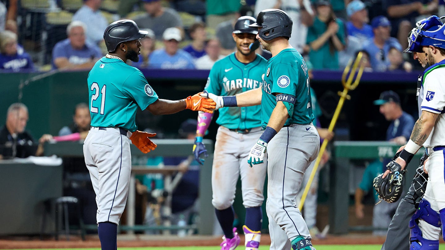 The Seattle Mariners Catcher Cal Raleigh (29) is congratulated by left Fielder Randy Aronzarena (21) after hitting a home drive at the top of the fourth round against Kansas City Royals at Kauffman Stadium in Kansas City, Missouri, September 16, 2025. (Scott Sewell/Imag images)