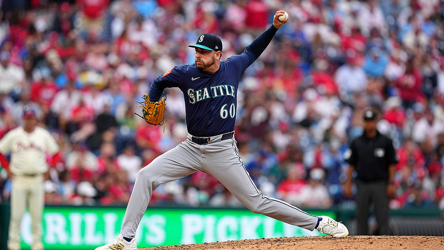 Tayler Sautero #60 of Seattle Mariners throws a pitch against Philadelphia Phillies in Citizens Bank Park on August 20, 2025 in Philadelphia, Pennsylvania. (Mitchell Leff/Getty Images)