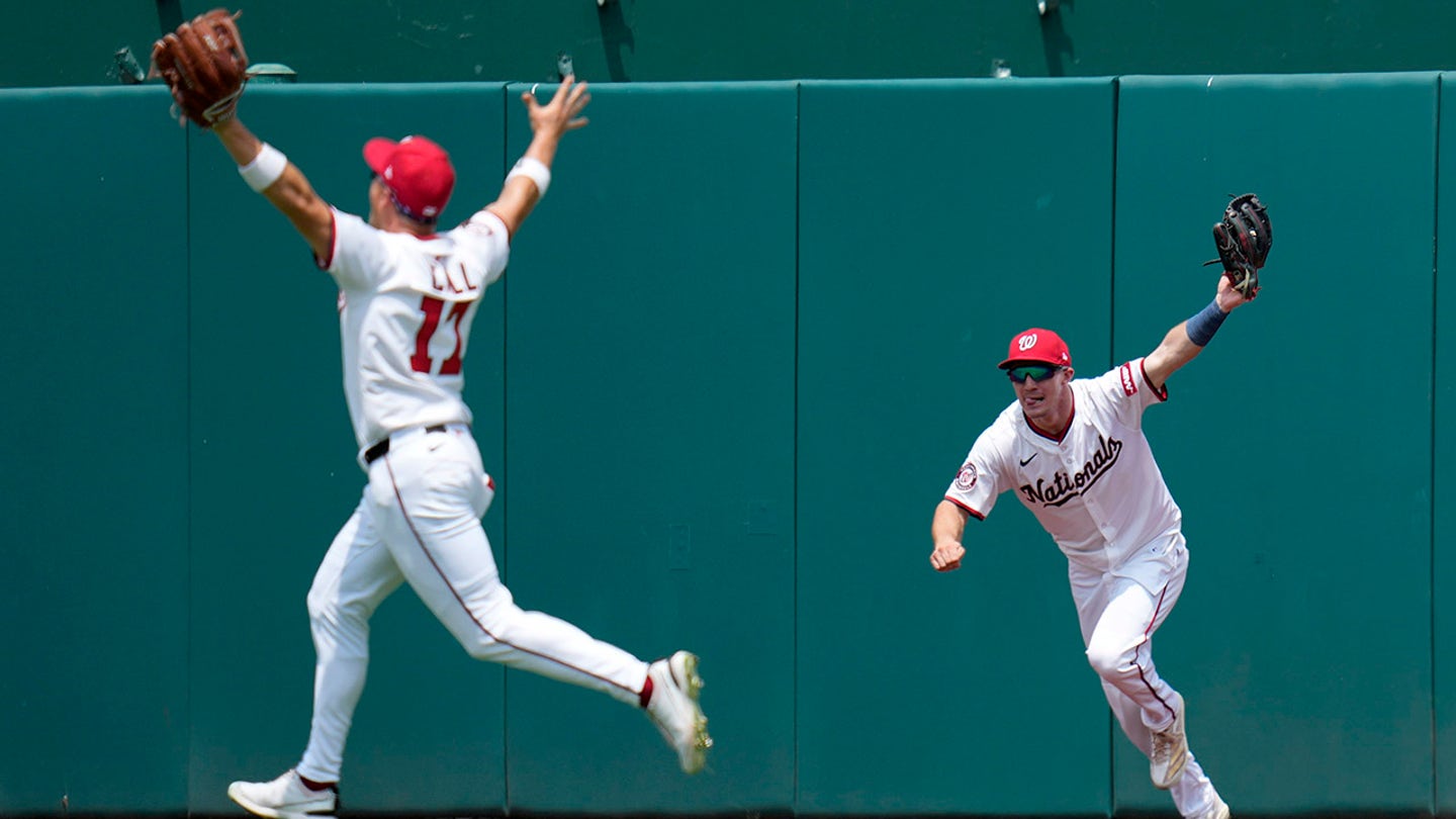 Jacob Young #30 of Washington Nationals celebrates with Alex Call #17 after caught a ball hit by Will Benson #30 of Cincinnati Reds during the eighth round in Nationals Park on July 23, 2025 in Washington, DC. (Jess Rapfogel/Getty Images)