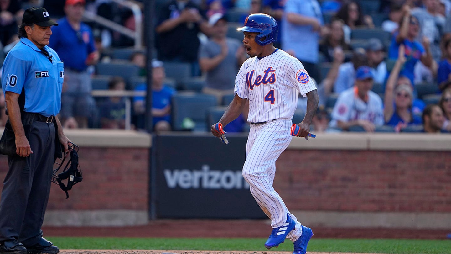 New York Mets center fielder Terrance Gore (4) reacts after scoring the go-ahead run on an RBI single by New York Mets center fielder Brandon Nimmo (9, not pictured) against the Pittsburgh Pirates during the eighth inning at Citi Field in New York City, New York, on September 18, 2022. (Gregory Fisher/USA TODAY Sports)