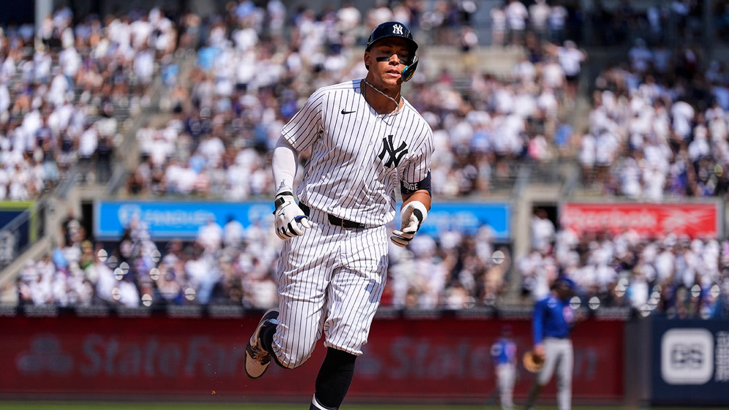 New York Yankees’ Aaron Judge (99) runs after striking a two -running driving during the round of a baseball match against Chicago Cubs, Saturday, July 12, 2025, in New York. (Yuki Iwamura/AP Photo)
