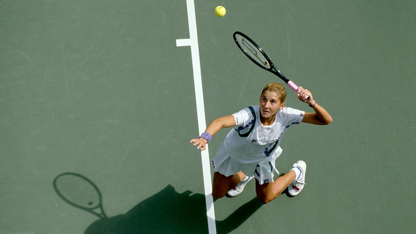 Monica Seles keeps her eyes on the tennis ball as she serves to Shaun Stafford in the United States under their women’s singles third round in the US Open on September 1, 1989 at the Usta National Tennis Center in Queens, New York. (Simon Bruty/Allsport/Getty Images)