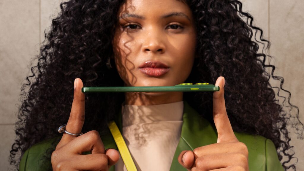 The phone is also visually interesting and is available in three nylon-inspired finishes: Pantone Gadget Grey, Pantone Lily Pad and Pantone Bronze Green.