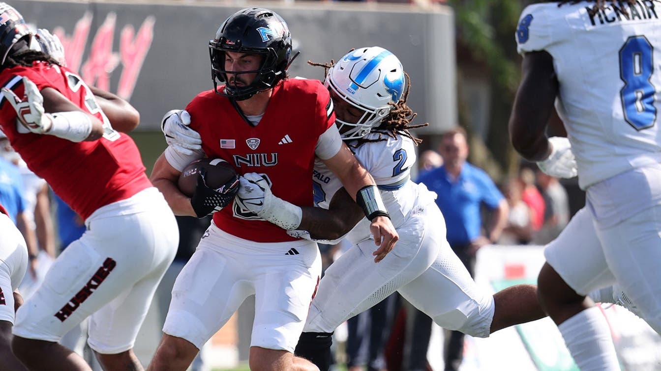 Northern Illinois Huskies quarterback Ethan Hampton (2) rushes the ball against Buffalo Bulls linebacker Red Murdock (2) during the first half at Huskie Stadium on Sept. 21, 2024. (Mike Dinovo/Imagn Images)