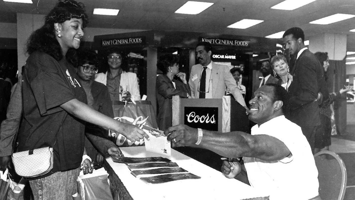 International bodybuilding champion Lee Haney gives out signed copies of his book at a bookstore on June 7, 1995. (Afro American Newspapers/Gado/Getty Images)