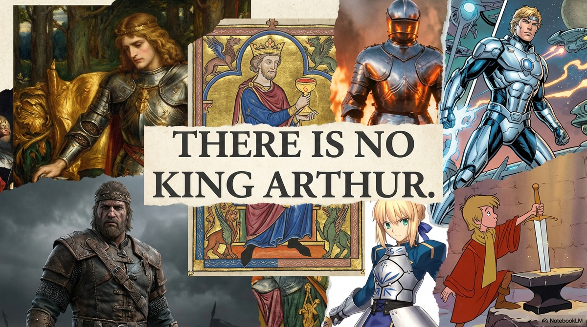 The opening image sets the tone immediately: a collage of Arthurian faces from medieval script king to anime knight, grimdark warlord and shiny sci-fi paladin arranged around the blunt declaration “THERE IS NO KING ARTHUR.” It’s a mission statement built into the design, and it announces the tire’s thesis with more confidence than most man-made opening glasses.