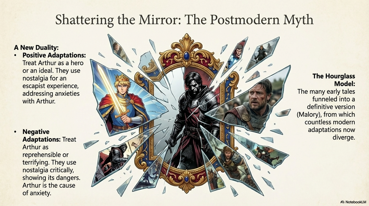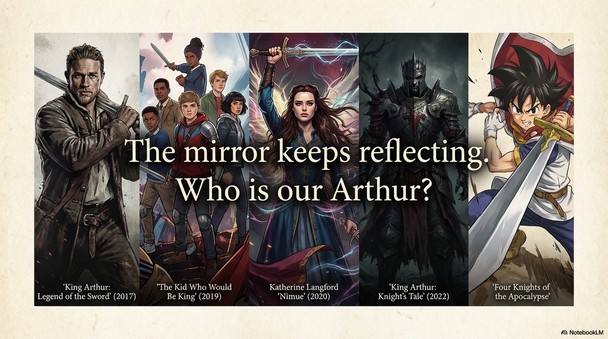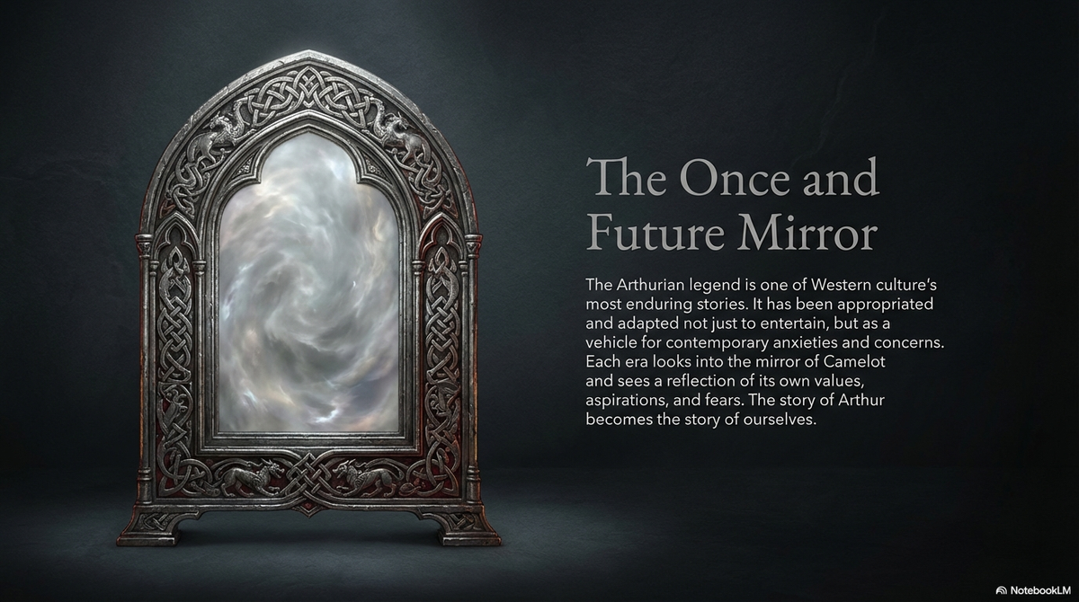 For the slide deck, I asked the AI to depict the Arthurian myth cycle at different historical stages, from its original form through the 21st century. After a few minutes, NotebookLM revealed Arthur the Endless Reflection. I’ve included a few sample images above, but they’re just a few of the 15 slides created by NotebookLM and Nano Banana Pro.