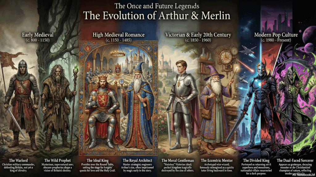 For this second infographic, I wanted a journey through historical eras showing how Arthur and Merlin’s appearances and roles have evolved over time. You can see the pair of them repeated across eras, looking very different each time and given a new title and description each time. The transitions over time are not only visual; they are thematic. Each pair reflects the politics, morals and aesthetics of the era. The fact that Nano Banana Pro could maintain character coherence while switching between medievalism and cyberpunk is frankly remarkable.