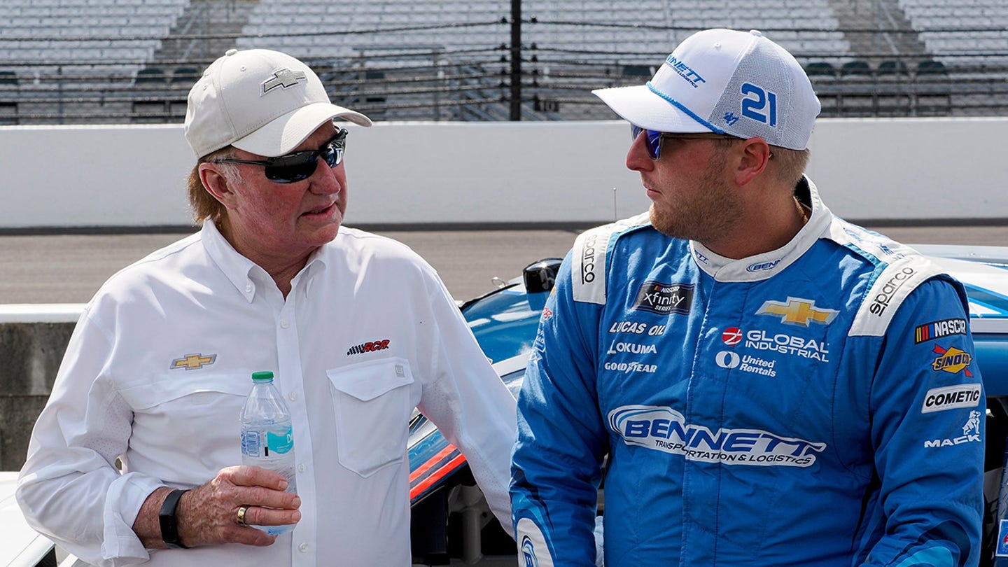 Richard Childress talks with the NASCAR XFINITY series Driver Austin Hill (21) Saturday, July 26, 2025, in front of Pennzoil 250 on Indianapolis Motor Speedway. (Bob Goshert / for Indystar / USA Today Network via Imag images)