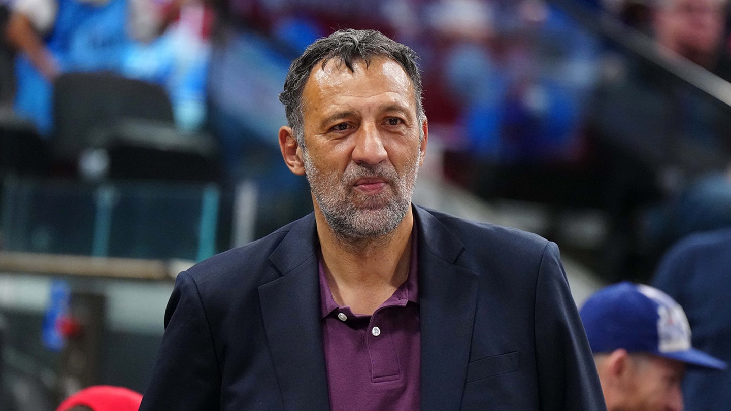 April 17, 2023; Sacramento, California: Sacramento King’s former player Vlade Divac sits court during the first quarter of match two of the first round of the 2023 NBA end game against the Golden State Warriors at the Golden 1 Center. (Kyle Terada-usa Today Sports)
