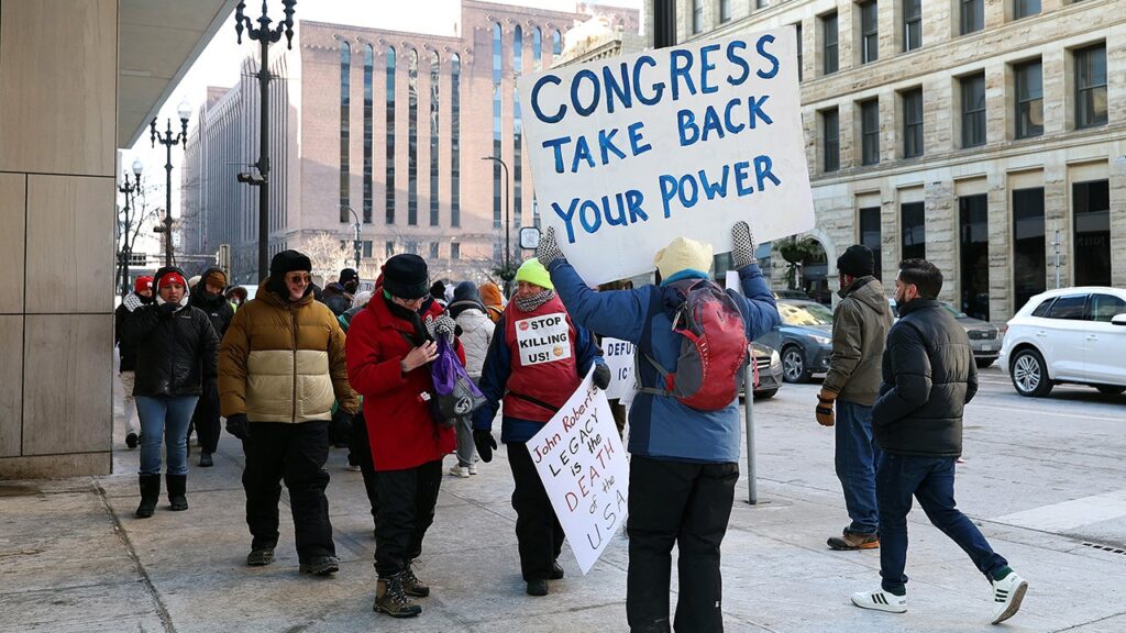 Protesters hold signs to protest the presence of federal agents in Minneapolis prior to the start of an NBA game between the Golden State Warriors and Minnesota Timberwolves at Target Center on January 25, 2026 in Minneapolis, Minnesota (David Berding/Getty Images)