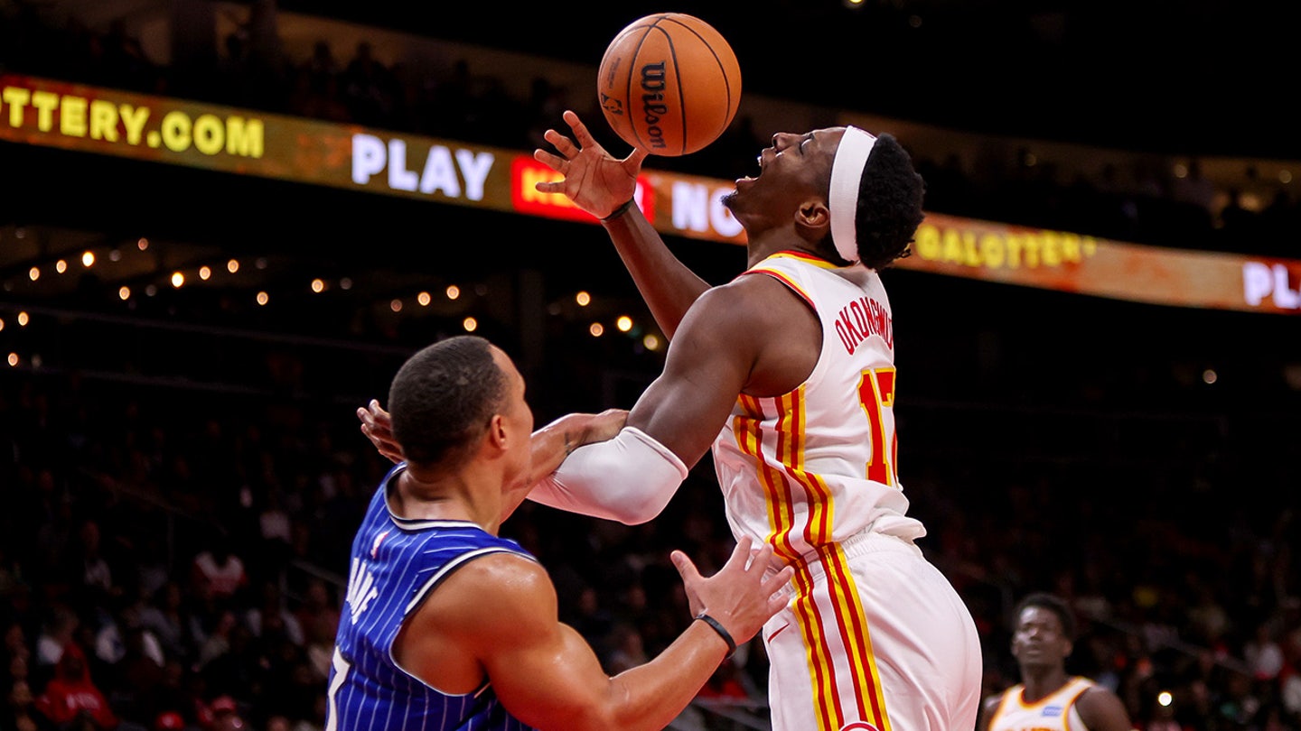 Onyeka Okongwu (17) of the Atlanta Hawks is fouled by Desmond Bane (3) of the Orlando Magic during the third quarter at State Farm Arena in Atlanta, Nov. 4, 2025. After an official review, Bane was charged with a technical foul and ejected after slamming the ball at Okongwu as he lay on the floor. (Kevin C. Cox/Getty Images)