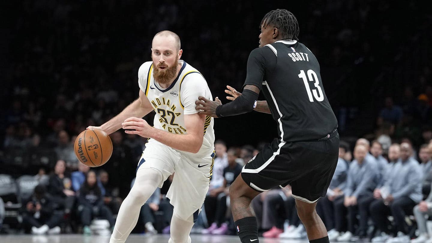 Indiana Pacers center Jay Huff dribbles the ball against Brooklyn Nets forward Trevon Scott during the second half at Barclays Center in Brooklyn on April 9, 2026. (Gregory Fisher/Imagn Images)