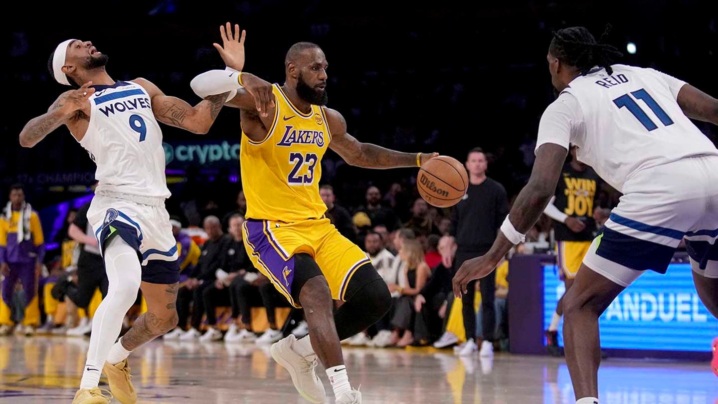 Lakers Spider LeBron James dribbles against Minnesota Timberwolves Guard Nickeil Alexander-Walker and Center Naz Reid in Los Angeles, Tuesday, April 22, 2025. (AP Photo/Eric Thayer)