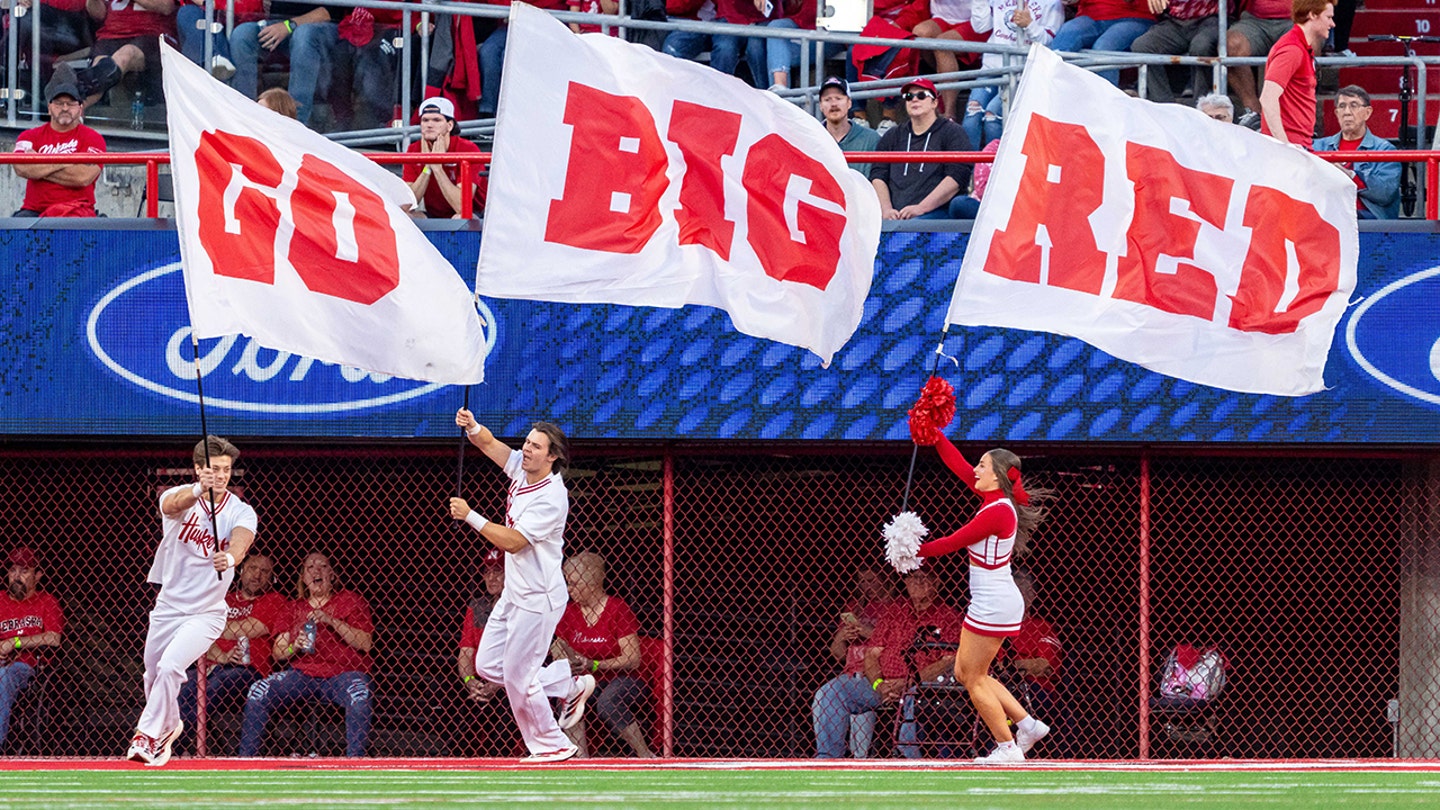 Nebraska Cornhuskers Cheerleaders run with flags in the final zone after a touchdown against Akron Zips during the second quarter at Memorial Stadium on September 6, 2025. (DYLAN WIDGER/IMAGN -PICTURES)