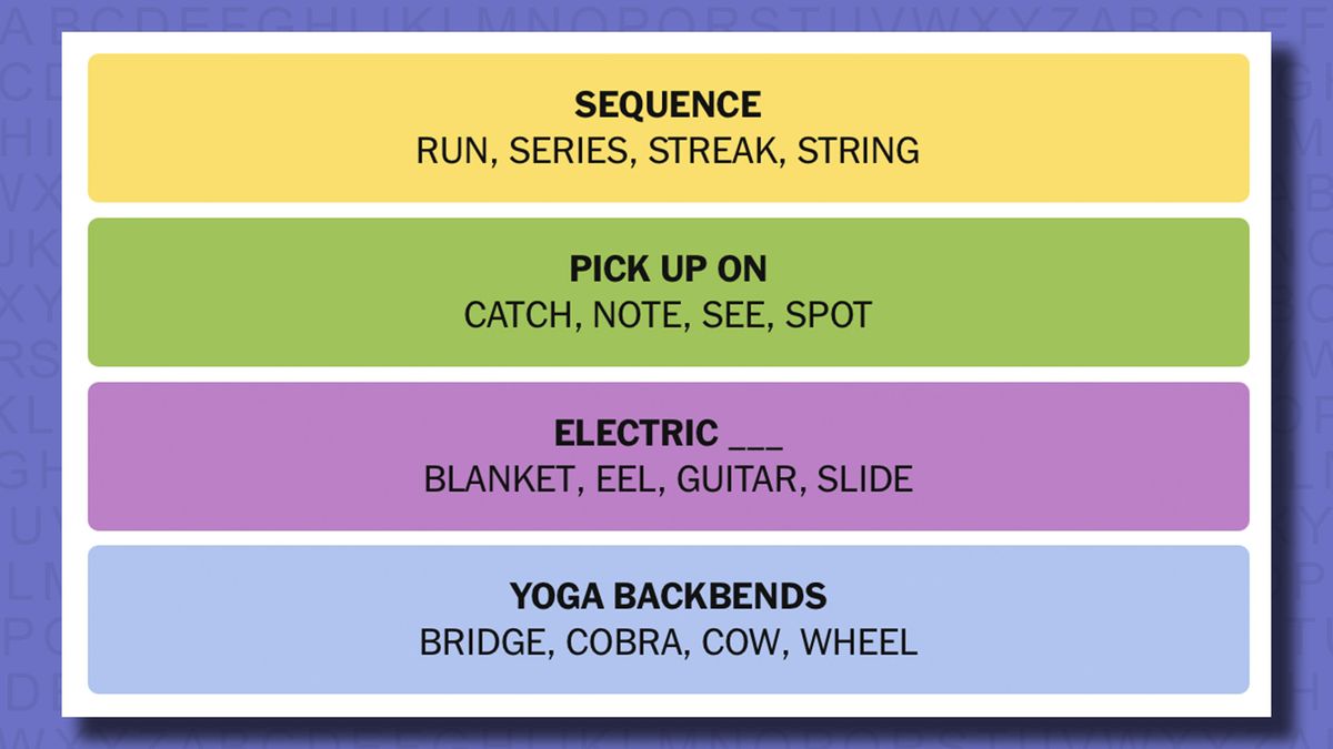 New Connections is one of several increasingly popular word games made by the New York Times. It challenges you to find groups of four objects that share something in common, and each group has another level of difficulty: green is light, yellow a little harder, blue often quite hard and purple usually very difficult.