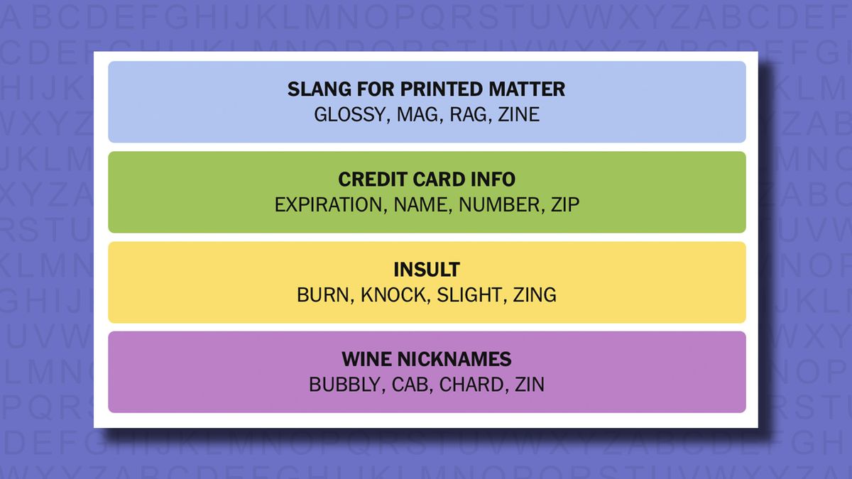 I got credit card info next time. Although I was a little confused by a zipper, I just thought that all four of these words seem like data, so that was the type of word rather than anything else.
