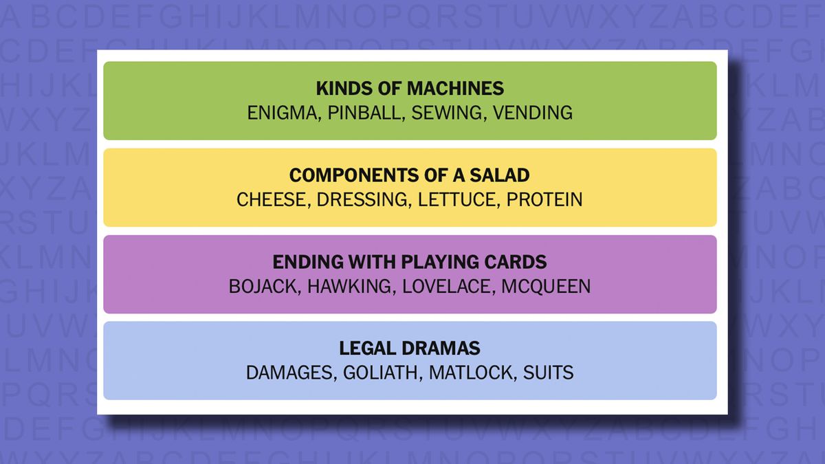 New Connections is one of several increasingly popular word games made by the New York Times. It challenges you to find groups of four objects that share something in common, and each group has another level of difficulty: green is light, yellow a little harder, blue often quite hard and purple usually very difficult.